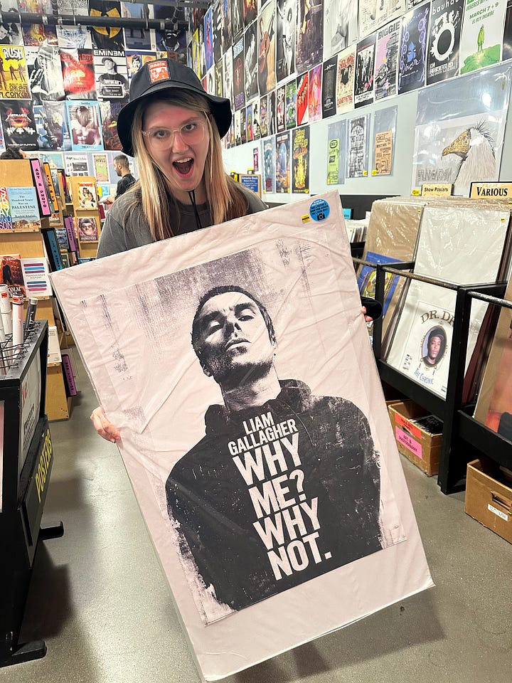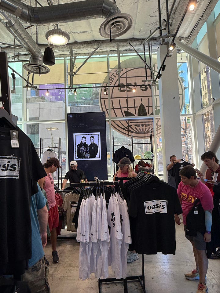 The journey itself felt like part of the experience. On my flight to Los Angeles I met another woman from Alabama also traveling solo for the show. The odds of that felt almost impossible. We stuck together through most of the trip. Our first stop was the Oasis pop up shop across from Amoeba Records. The line stretched forever but I had a reservation and managed to get inside. It felt like a frenzy, like stories I had heard about Black Friday in the nineties. Fans were grabbing whatever they could. Shelves emptied fast but I still left with a stack of treasures. My favorites were a bucket hat, a Mircodot Creative designed program, and a cream sweater embroidered with Noel’s face.